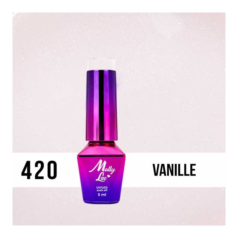 Kolekcję Madame French otwiera kolor 420 Vanille o delikatnym odcieniu puszystego puddingu waniliowego z drobnoziarnistymi, mieniącymi się złotymi iskierkami. Lekki, jak wiosenny wiatr, który sprawdzi się idealnie w samodzielnych stylizacjach typu glamour french lub jako kolor do zdobień.