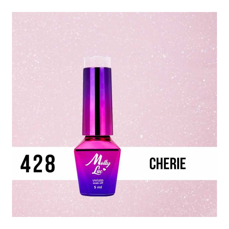 Kolor 428 Cherie z kolekcji Madame French to przepiękny rozbielony kolor nude z delikatnym, zachwycającym srebrnym brokatem. Będzie cudownie wyglądał zarówno jako samodzielny kolor, jak i kolor bazowy do babyboomera i french manicure. Zachwyca dziewczęcym urokiem, błyszczy romantycznie przy każdym ruchu dłoni w promieniach słonecznych – będzie zatem idealny dla panien młodych.