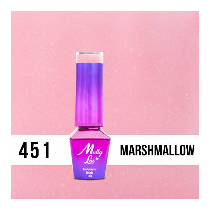 Odcień 451. Marshmallow to róż z kropelką brzoskwini, w którym zatopione są drobinki brokatu w kolorze nienachalnej magenty. Kolor to niepowtarzalna kompozycja pełna pasji i przyjemności, której nie będziesz mogła się oprzeć.