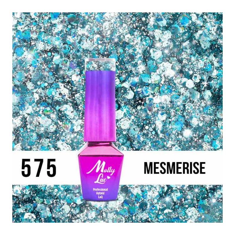 575 Mesmerise Delikatny morski błękit z nutą zieleni i holograficzną drobiną w srebrnym wydaniu to propozycja dla rządnych błysku w ciekawym kolorze kobiet.Zanurz się w otchłani miliona iskrzących drobinek! Idealna proporcja maluteńkich i większych cząsteczek to gwarancja stylizacji idealnej!