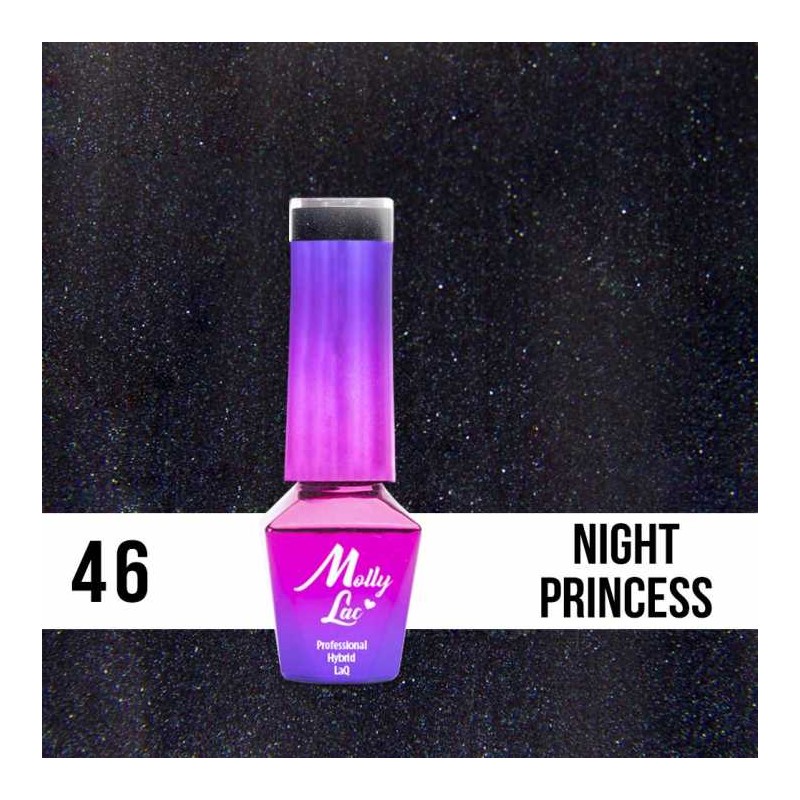 46. Night princess -Złocisty pył zatopiony w czarnej, perłowej toni. Wyjątkowy kolor, który zachwyca przy każdym ruchu Twojej ręki. Wspaniała poświata mieniąca się milionem drobniutkich iskierek dopełni każdą stylizację. Zaskoczysz wszystkich niezwykłym kolorem w błyszczącej kompozycji?